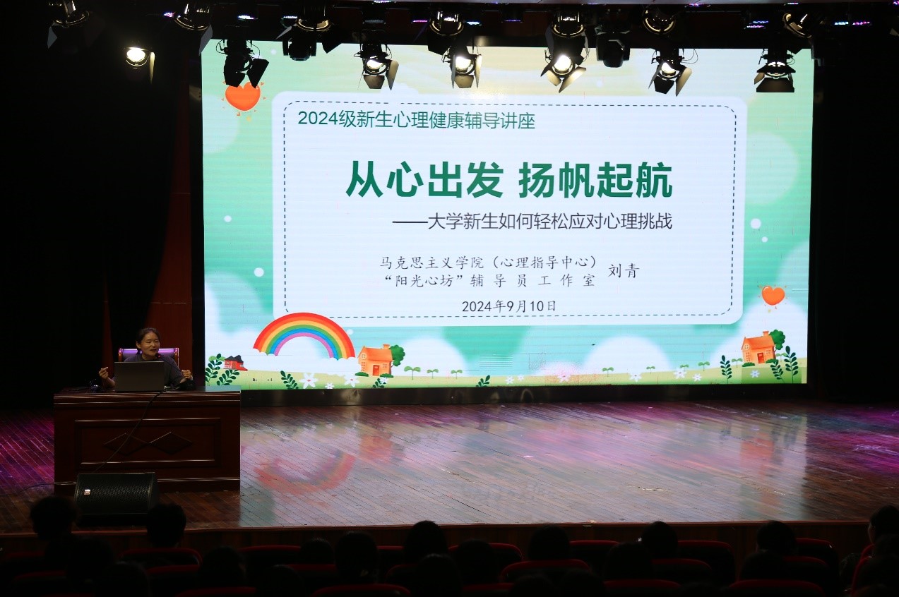 为了让大一新生更好地适应大学生活,提高其心理健康意识,我校于2024年9月10日在励德厅举办了一场以“从心出发 扬帆起航”为主题的心理健康辅导讲座。本次讲座由我校人人精品无人区亚洲精品心理指导中心刘青老师主讲,我校2024级全体新生通过现场聆听和线上学习相结合的方式参与了该讲座。