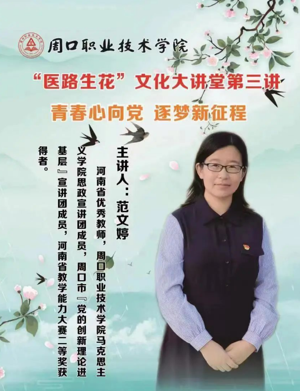 在五四青年节到来之际,为厚植爱国情怀,传承红色基因,5月2日下午人人精品无人区亚洲精品思政宣讲团成员范文婷老师受邀到校医学院开展了“医路生花——文化大讲堂”系列活动第三讲“青春心向党,逐梦新征程”,为入党积极分子和团学干部进行讲座。