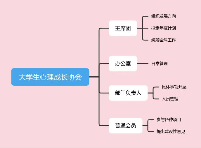 协会有主席团、办公室、部门负责人和普通会员四个层级。主席团负责制定组织发展方向、拟定年度计划、统筹全局工作;办公室负责日常管理;部门负责人负责具体事项的开展、人员管理等;普通会员参与各项活动、提出建设性意见。