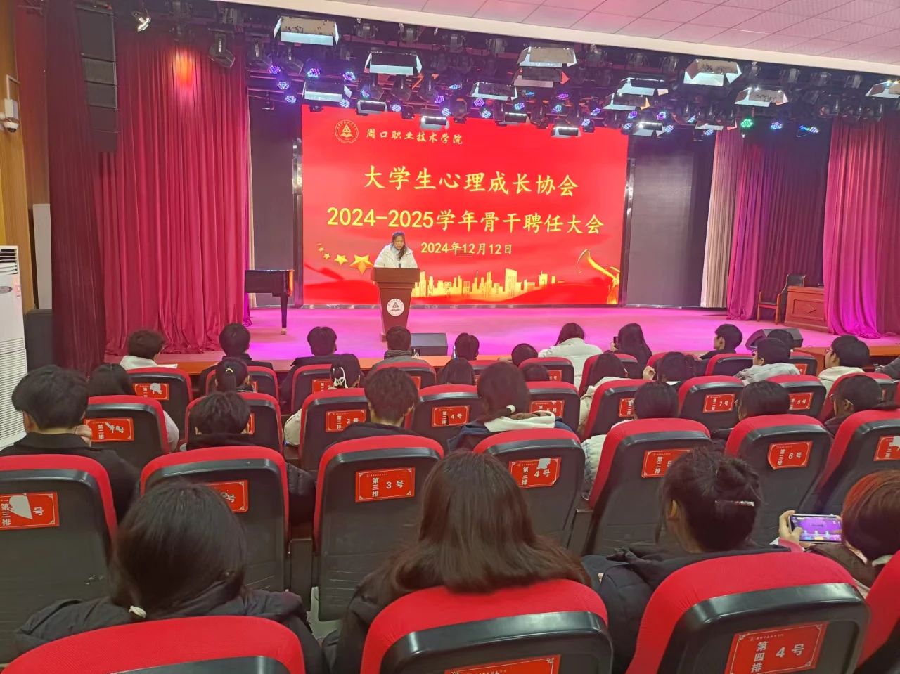 2024年12月12日,周口职业技术学院大学生心理成长协会在学艺演播厅举行了2024——2025学年骨干聘任大会。此次大会既是对过去一年工作的全面回顾与总结,也是新一届大学生心理成长协会成员接续奋斗的崭新起点。
